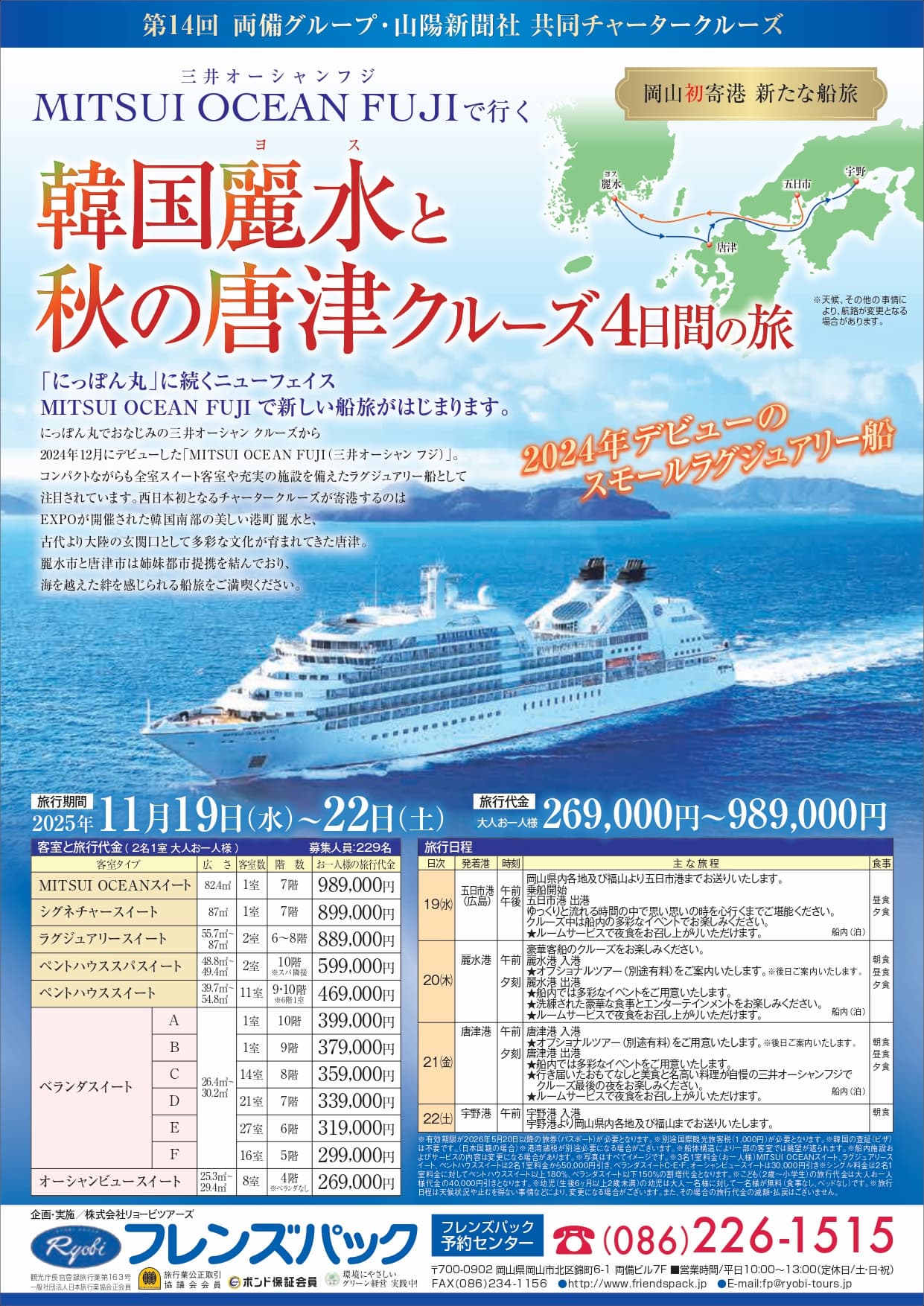 No.535 MITSUI OCEAN FUJI 韓国麗水と秋の唐津クルーズ4日間の旅 [ベランダスイートC客室]【岡山・福山発着】11月19日(水)発